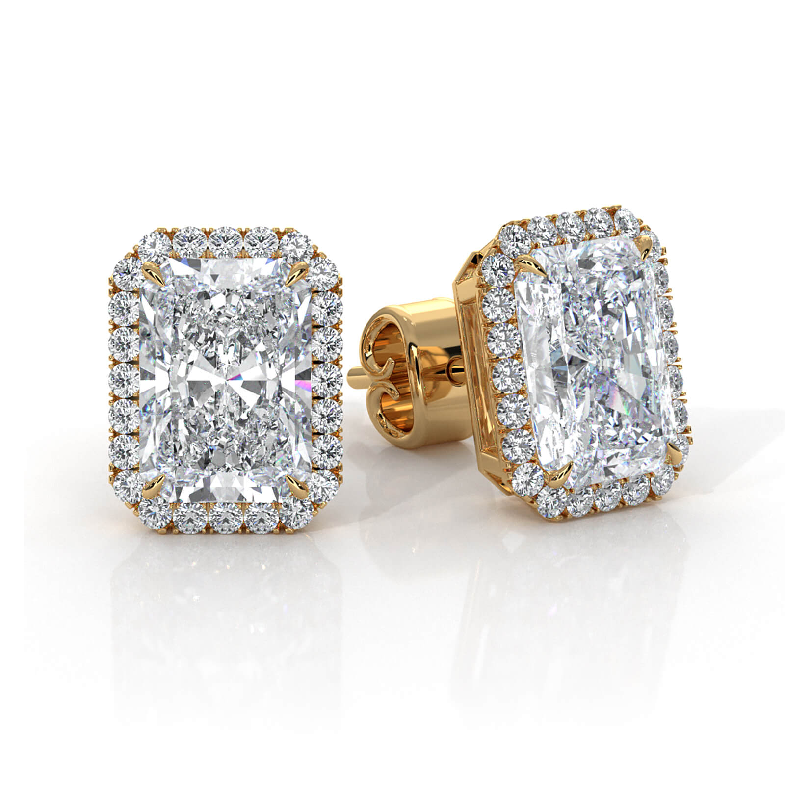 This elegant halo radiant lab grown diamond claw prong earrings for women's made in 14k Gold Yellow. This earring features a matched pair of carat radiant diamond secured in claw prong setting with IGI Certified. Perfect for a gift! Also available in 14k & 18k white gold, yellow gold, rose gold and platinum 950. If you don't find your desired jewelry, please don't hesitate to contact our designer to make your custom jewelry design. (3.24Ct. tw.)