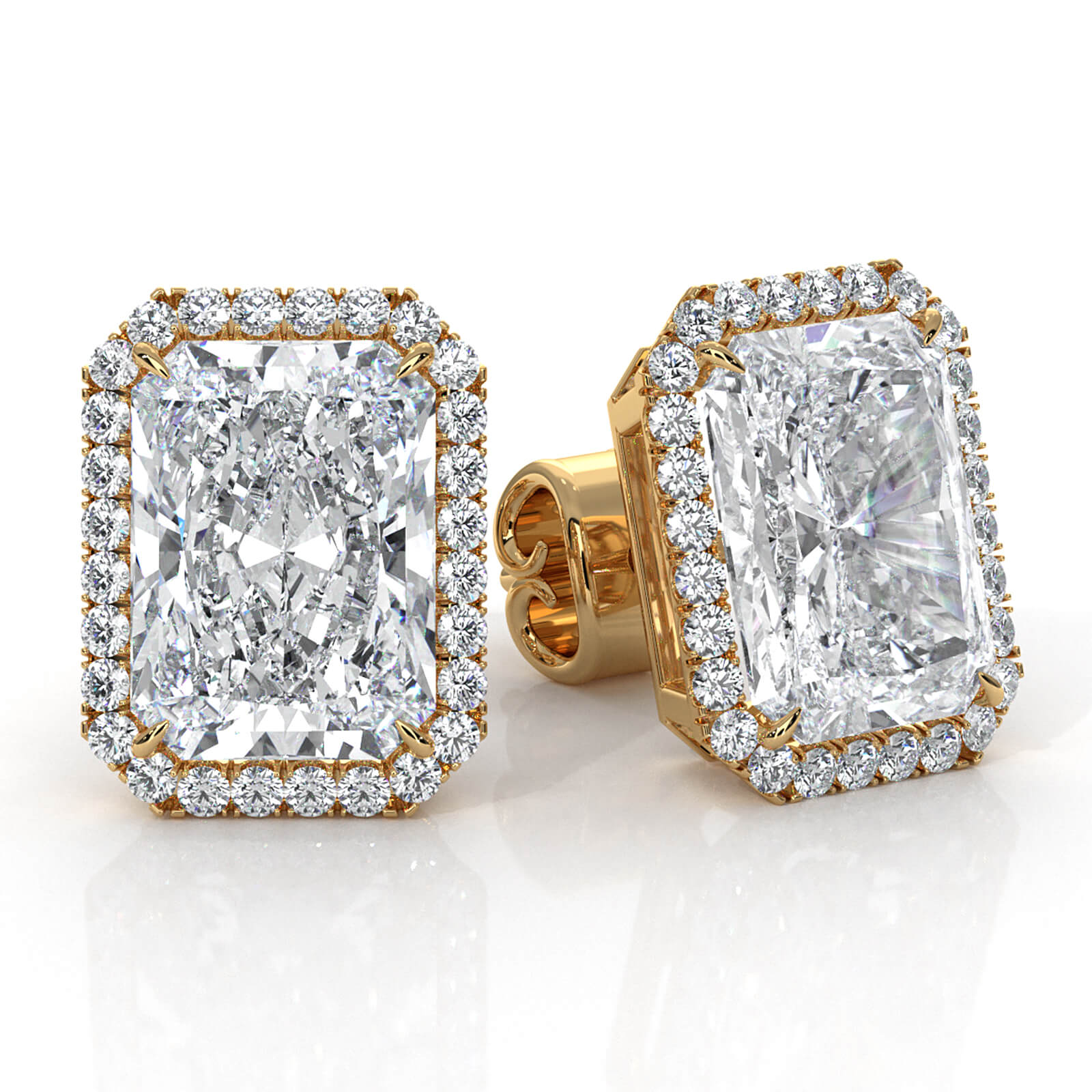 Beautiful claw prong women's radinat lab grown diamond earrings made in 18k Gold Yellow. This elegant diamond earrings showcases carat center radiant diamond secured with claw prongs and