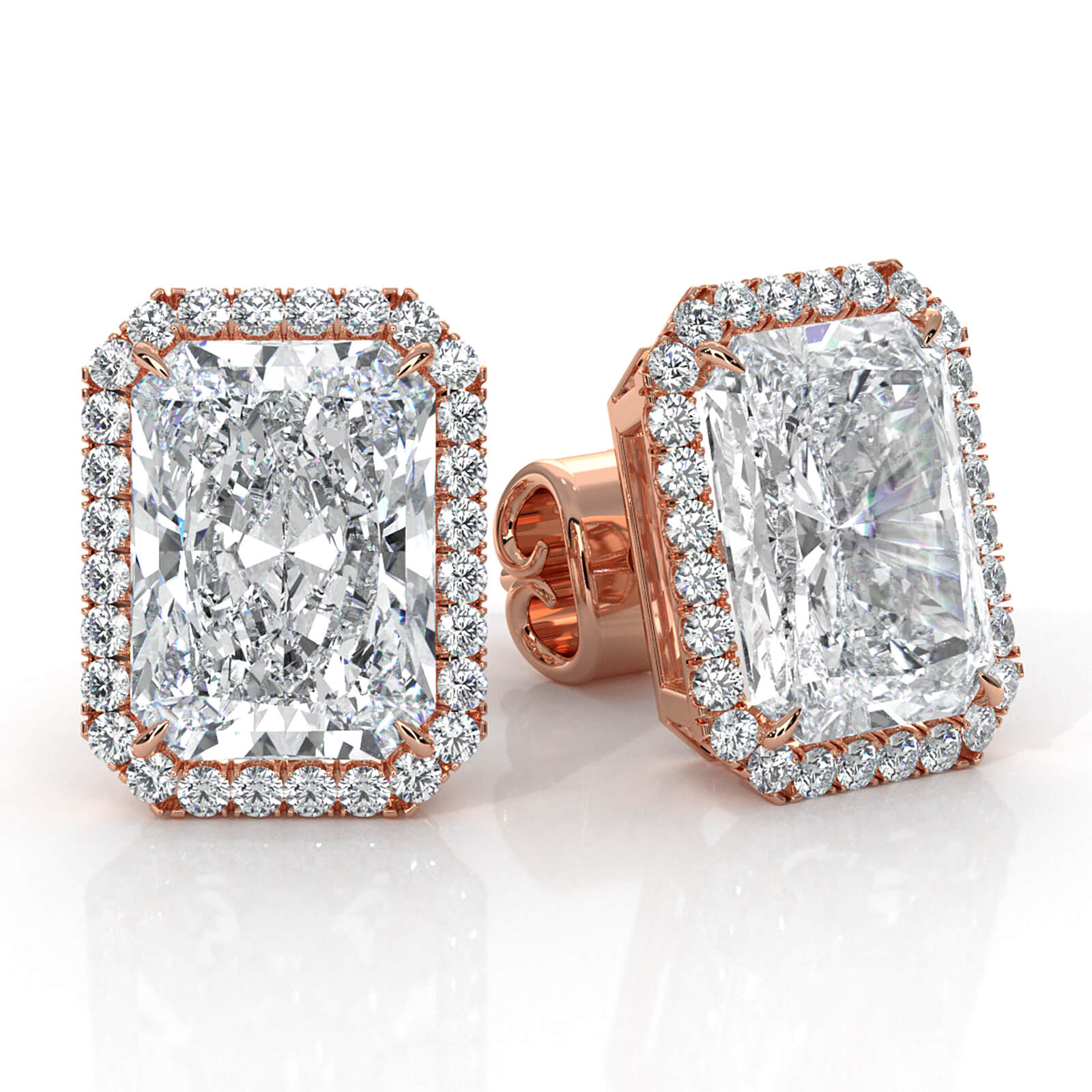 Beautiful claw prong women's radinat lab grown diamond earrings made in 18k Rose Gold. This elegant diamond earrings showcases carat center radiant diamond secured with claw prongs and