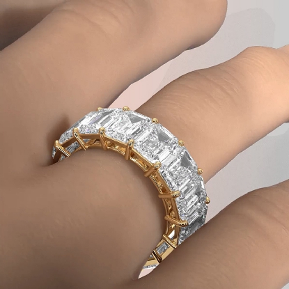 Exquisitely handcrafted shared prong women's eternity emerald cut lab-grown diamond wedding band shimmer brightly in this 14k Gold Yellow. This wedding band showcases a carat emerald diamonds in shared prong setting IGI Certified. This simply elegant ring will look so good on your finger, also available in 14k & 18k white gold, yellow gold, rose gold and platinum 950. If you don't find your desired jewelry, please don't hesitate to contact our designer to make your custom jewelry design. (13.3Ct. tw.)