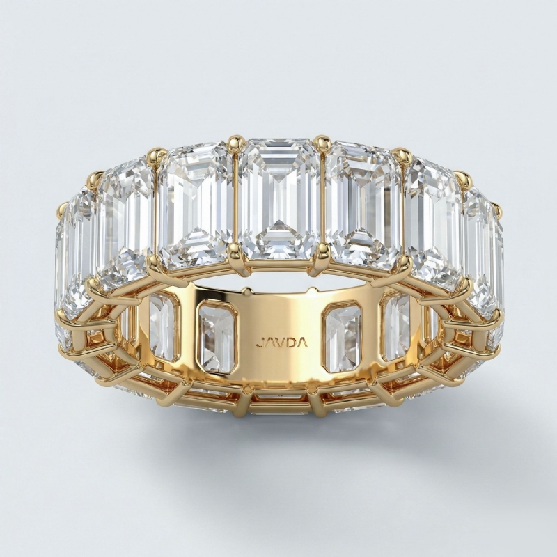 This gorgeous eternity emerald cut lab-grown diamond women's wedding band handcrafted in 18k Gold Yellow. This comfortable eternity wedding ring showcases carat emerald diamonds in a shared prong setting on high polished metal IGI Certified. This wedding ring symbolize love and commitment. Also available in 14k & 18k white gold, yellow gold, rose gold and platinum 950. If you don't find your desired jewelry, please don't hesitate to contact our designer to make your custom jewelry design. (13.2Ct. tw.)