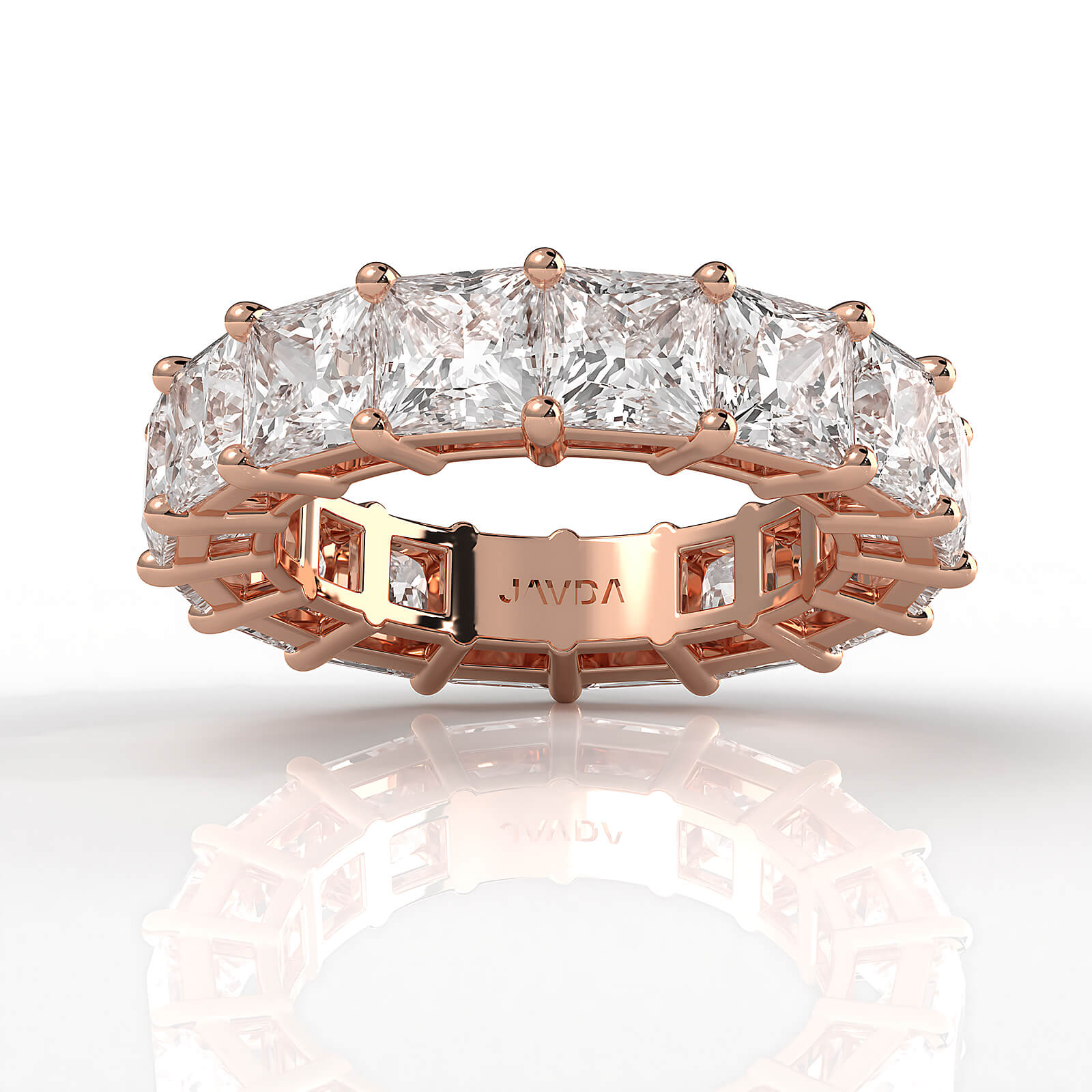 Gorgeous princess lab grown diamond women's eternity wedding band handmade in 18k Rose Gold IGI Certified, this will look fabulous on any outfit. Showcases carat princess diamond beautifully secured with shared prong setting. Perfect gift for her. Also available in 14k & 18k white gold, yellow gold, rose gold and platinum 950. If you don't find your desired jewelry, please don't hesitate to contact our designer to make your custom jewelry design. (9.6Ct. tw.)