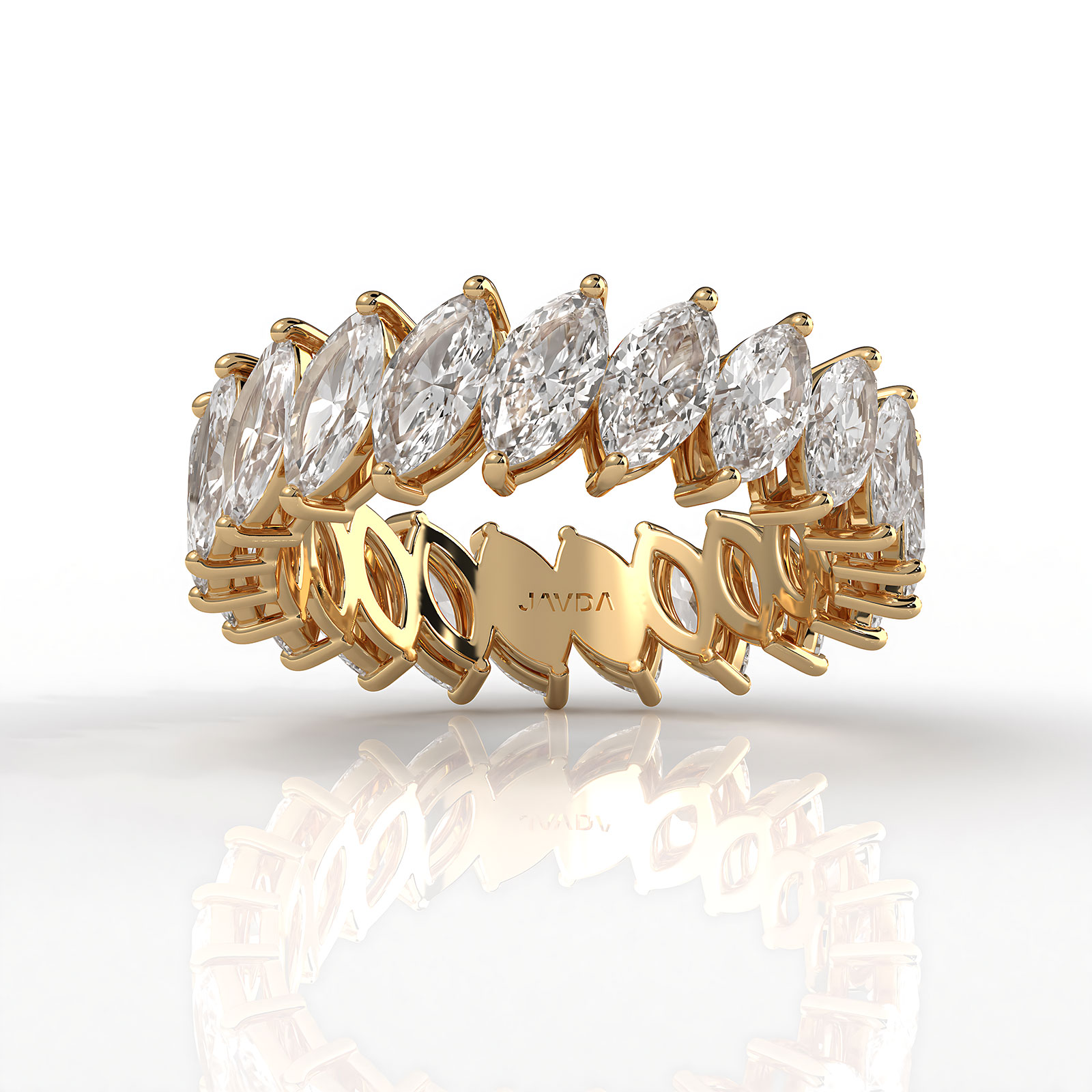 Gleaming simple and delicate 20 stone of marquise cut lab grown diamond women's eternity wedding band fashion ring handcrafted in 18k Gold Yellow. Showcases carat in a shared prong setting with IGI Certified. Perfect for stacking with your everyday ring. Also available in 14k & 18k white gold, yellow gold, rose gold and platinum 950. If you don't find your desired jewelry, please don't hesitate to contact our designer to make your custom jewelry design. (3.6Ct. tw.)