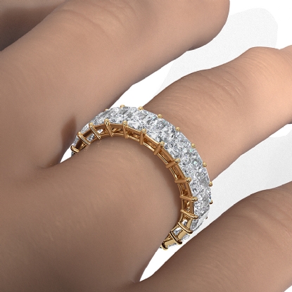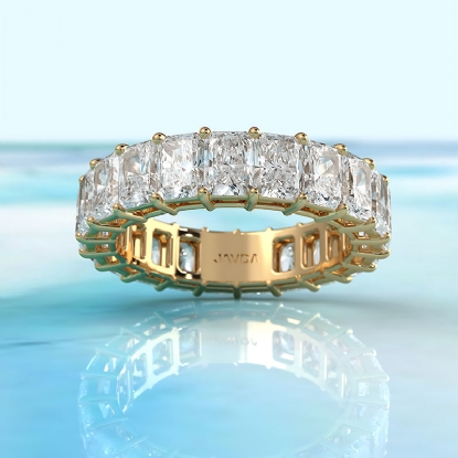 Statement piece, this shared prong women's eternity wedding band is beautiful on it's own or paired with an engagement ring. Features carat radiant shape lab grown diamond is crafted in 18k Gold Yellow. Also available in 14k & 18k white gold, yellow gold, rose gold and platinum 950. If you don't find your desired jewelry, please don't hesitate to contact our designer to make your custom jewelry design. (5.7Ct. tw.)