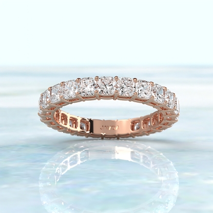 This cushion cut lab grown diamond women's eternity wedding band crafted in 14k Rose Gold. This anniversary ring is set with 23 stone brilliant cut cushion diamonds totaling carat. Also available in 14k & 18k white gold, yellow gold, rose gold and platinum 950. If you don't find your desired jewelry, please don't hesitate to contact our designer to make your custom jewelry design. (2.7Ct. tw.)