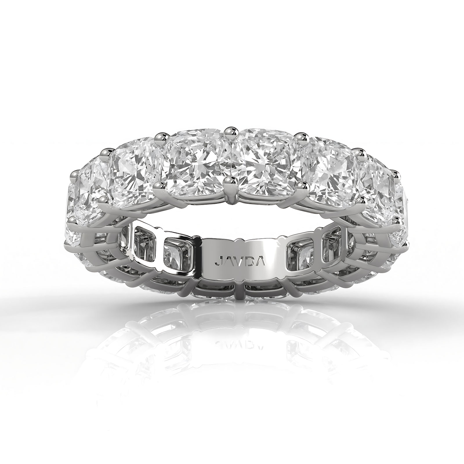 This fashionable cushion shape lab grown diamond women's eternity wedding band handmade in 18k Gold White. This beautiful anniversary ring showcases carat cushion cut diamond in a shared prong setting with a high polished metal, gives any outfit a dash of glitz. This wedding band is a symbol of grace and self-expression, also available in 14k & 18k white gold, yellow gold, rose gold and platinum 950. If you don't find your desired jewelry, please don't hesitate to contact our designer to make your custom jewelry design. (8.25Ct. tw.)
