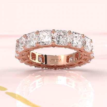 This fashionable cushion shape lab grown diamond women's eternity wedding band handmade in 14k Rose Gold. This beautiful anniversary ring showcases carat cushion cut diamond in a shared prong setting with a high polished metal, gives any outfit a dash of glitz. This wedding band is a symbol of grace and self-expression, also available in 14k & 18k white gold, yellow gold, rose gold and platinum 950. If you don't find your desired jewelry, please don't hesitate to contact our designer to make your custom jewelry design. (8.25Ct. tw.)