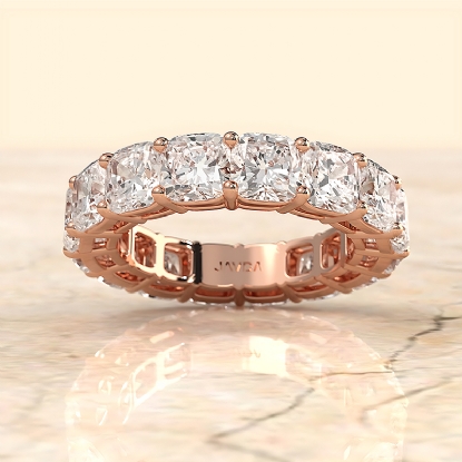 A timeless women's eternity cushion shape lab grown diamond women's wedding band crafted in 14k Rose Gold. Showcases carat cushion diamond in a shared prong setting. Mix and match with other stackable ring, also available in 14k & 18k white gold, yellow gold, rose gold and platinum 950. If you don't find your desired jewelry, please don't hesitate to contact our designer to make your custom jewelry design. (9.6Ct. tw.)