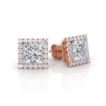 Gorgeous pair of women's halo princess lab-grown diamond earrings crafted in 14k Rose Gold. These elegant earrings feature a princess center diamond secured with claw prongs, complemented by small round side diamonds in a french u cut pave setting IGI Certified. Also available in 14k & 18k white gold, yellow gold, rose gold and platinum 950. If you don't find your desired jewelry, please don't hesitate to contact our designer to make your custom jewelry design. (2.22Ct. tw.)