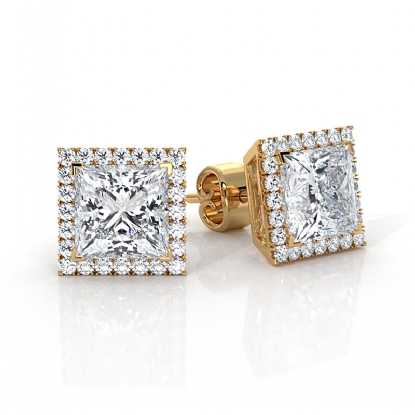Breathtaking claw prong women's princess lab-grown diamond earrings crafted in 14k Gold Yellow. These sophisticated earrings showcase a princess center diamond secured with claw prongs, complemented by small round side diamonds in a french u cut pave setting IGI Certified. Also available in 14k & 18k white gold, yellow gold, rose gold and platinum 950. If you don't find your desired jewelry, please don't hesitate to contact our designer to make your custom jewelry design. (3.26Ct. tw.)
