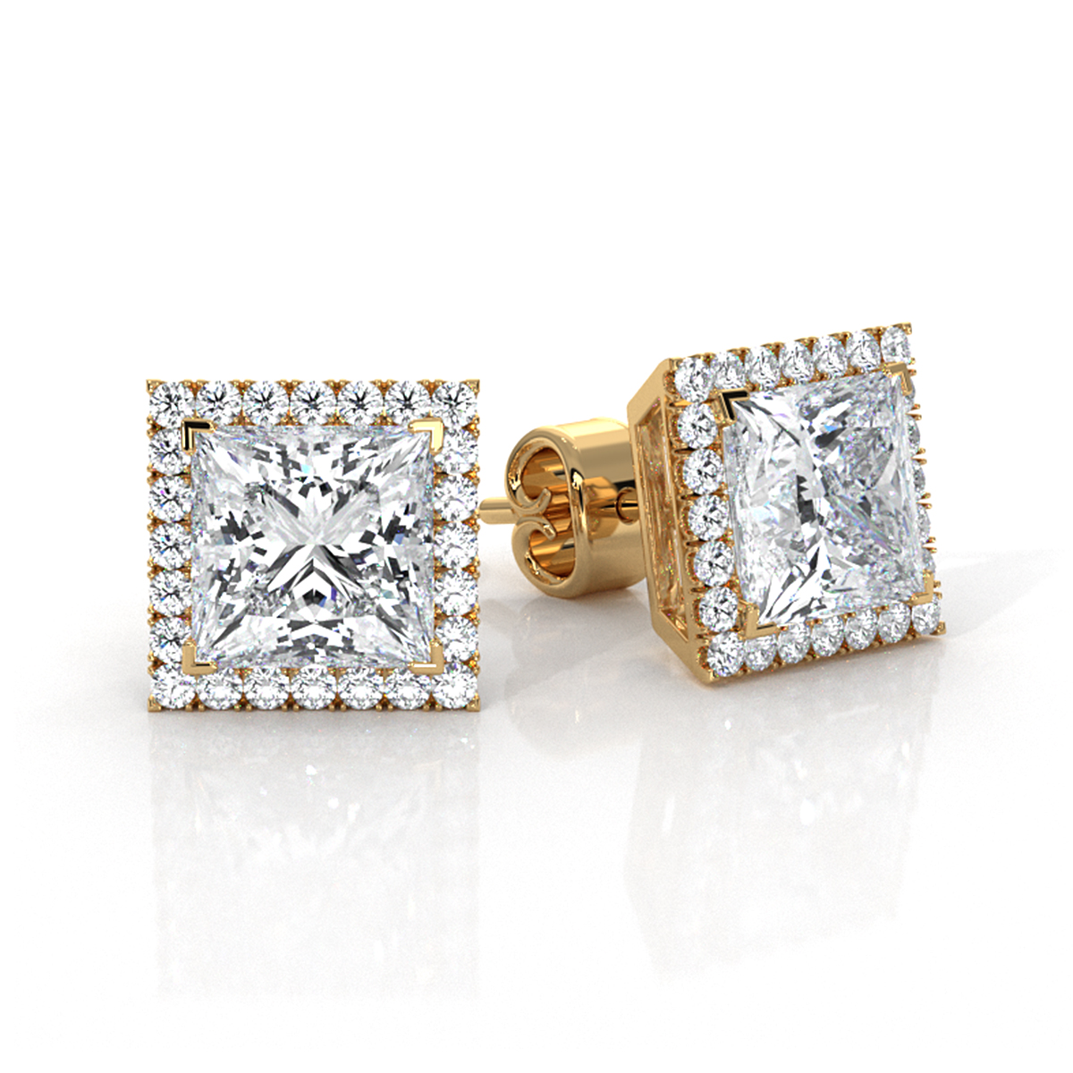 Breathtaking claw prong women's princess lab-grown diamond earrings crafted in 18k Gold Yellow. These sophisticated earrings showcase a princess center diamond secured with claw prongs, complemented by small round side diamonds in a french u cut pave setting IGI Certified. Also available in 14k & 18k white gold, yellow gold, rose gold and platinum 950. If you don't find your desired jewelry, please don't hesitate to contact our designer to make your custom jewelry design. (3.26Ct. tw.)