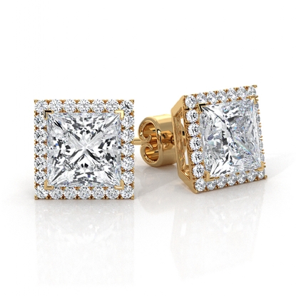 Elegantly fashioned, this pair of princess lab grown diamond women's halo earrings is made in 14k Gold Yellow. These stunning classic earrings feature carat, IGI Certified, securely held by claw prongs certified by IGI. This earring design can also be customized with your choice of center diamond and gold metal in 14k and 18k white gold, yellow gold, rose gold, and platinum 950. If you don't find your desired jewelry, please don't hesitate to contact our designer to make your custom jewelry design. (4.31Ct. tw.)