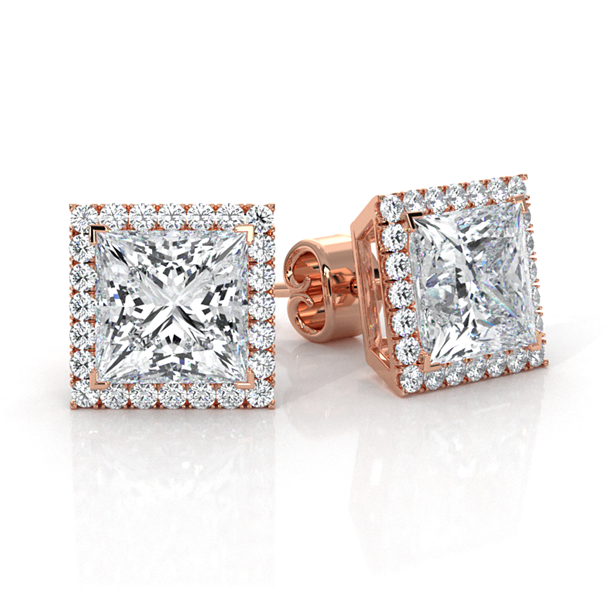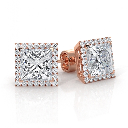 Elegantly fashioned, this pair of princess lab grown diamond women's halo earrings is made in 14k Rose Gold. These stunning classic earrings feature carat, IGI Certified, securely held by claw prongs certified by IGI. This earring design can also be customized with your choice of center diamond and gold metal in 14k and 18k white gold, yellow gold, rose gold, and platinum 950. If you don't find your desired jewelry, please don't hesitate to contact our designer to make your custom jewelry design. (4.31Ct. tw.)