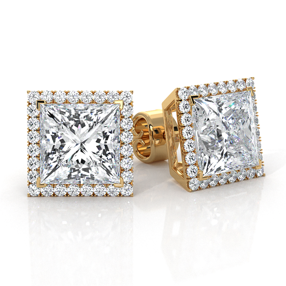 Stunning pair of halo princess lab grown diamond women's earrings made in 14k Gold Yellow. These beautiful earrings features carat princess diamond secured with claw prong setting and
