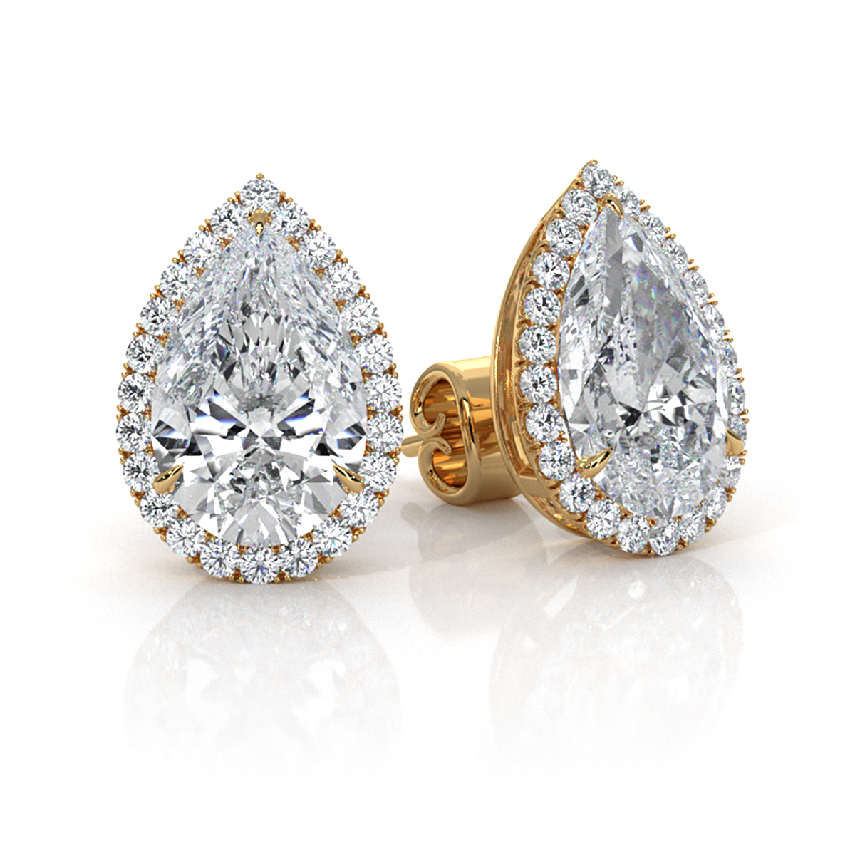Exquisite pair of halo pear shape lab grown diamond women's stud earrings, expertly crafted in 18k Gold Yellow and IGI certified. These magnificent earrings will enhance any ensemble. Featuring a carat total weight center diamond encircled by a sparkling halo of smaller diamonds, all securely set in claw prongs. Also available in 14k & 18k white gold, yellow gold, rose gold and platinum 950. If you don't find your desired jewelry, please don't hesitate to contact our designer to make your custom jewelry designs. (4.31Ct. tw.)