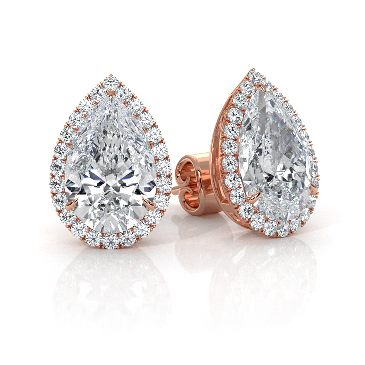 Exquisite pair of halo pear shape lab grown diamond women's stud earrings, expertly crafted in 14k Rose Gold and IGI certified. These magnificent earrings will enhance any ensemble. Featuring a carat total weight center diamond encircled by a sparkling halo of smaller diamonds, all securely set in claw prongs. Also available in 14k & 18k white gold, yellow gold, rose gold and platinum 950. If you don't find your desired jewelry, please don't hesitate to contact our designer to make your custom jewelry designs. (4.31Ct. tw.)
