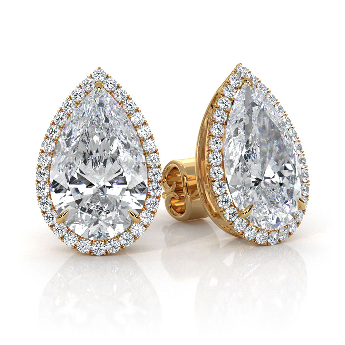 "Shimmer and Shine with Every Pair" of halo pear cut lab grown diamond women's earrings, expertly fashioned in brilliant 18k Gold Yellow and IGI certified. Featuring a carat total weight pear diamond, encircled by a luminous halo of smaller diamonds, all securely set with claw prongs. Also available in 14k & 18k white gold, yellow gold, rose gold and platinum 950. If you don't find your desired jewelry, please don't hesitate to contact our designer to make your custom jewelry designs. (6.36Ct. tw.)