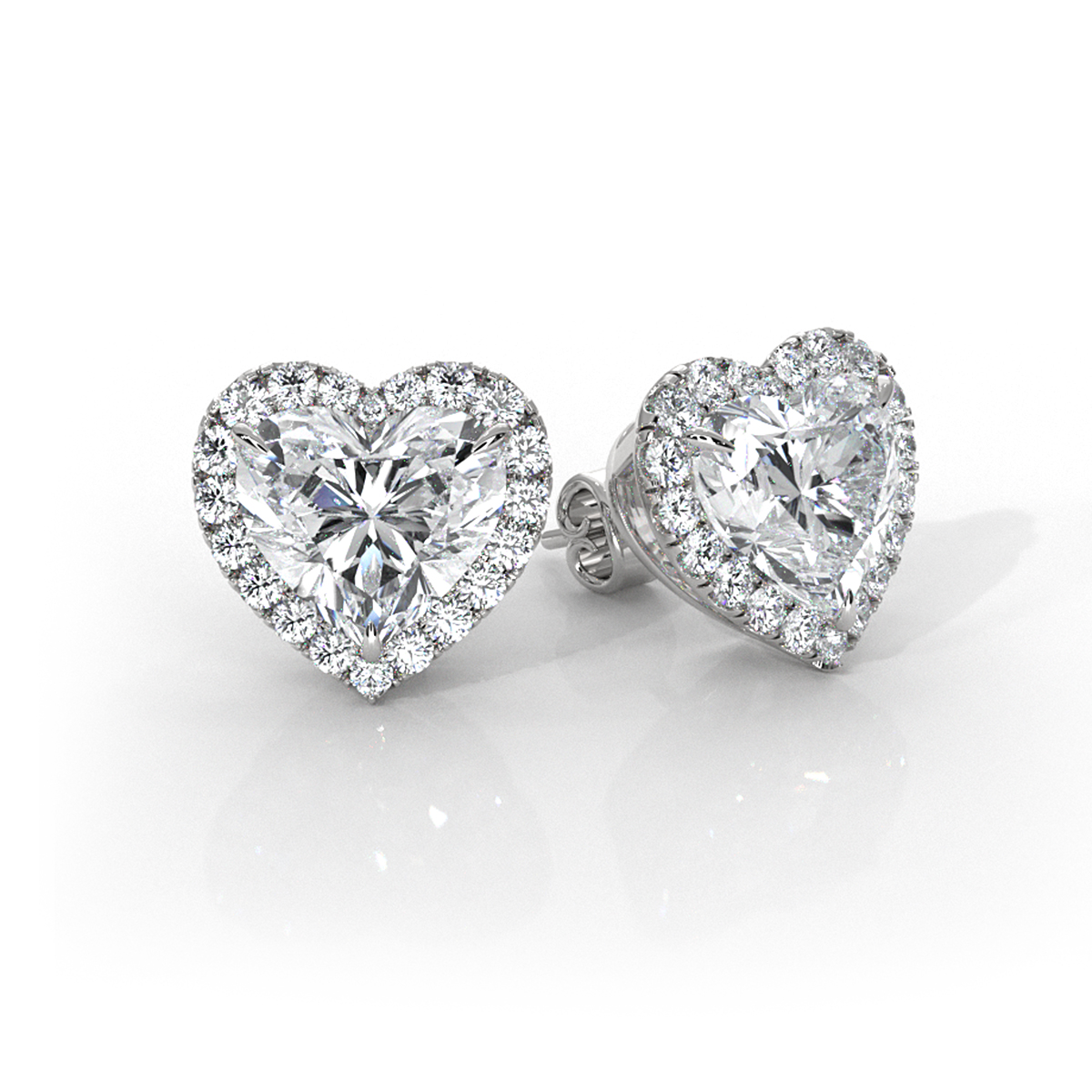 Sophisticated pair of halo heart lab grown diamond women's basket style earrings, skillfully fashioned in gleaming 18k Gold White and IGI certified. This timeless earring features a heart diamond in claw prong setting and