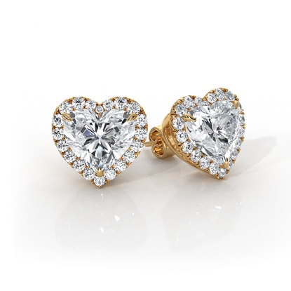 Sophisticated pair of halo heart lab grown diamond women's basket style earrings, skillfully fashioned in gleaming 18k Gold Yellow and IGI certified. This timeless earring features a heart diamond in claw prong setting and