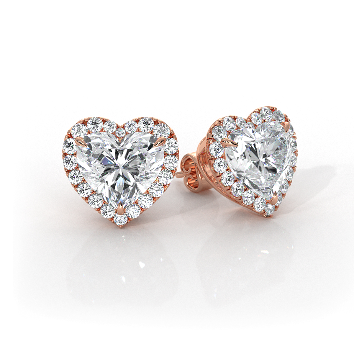 Sophisticated pair of halo heart lab grown diamond women's basket style earrings, skillfully fashioned in gleaming 18k Rose Gold and IGI certified. This timeless earring features a heart diamond in claw prong setting and