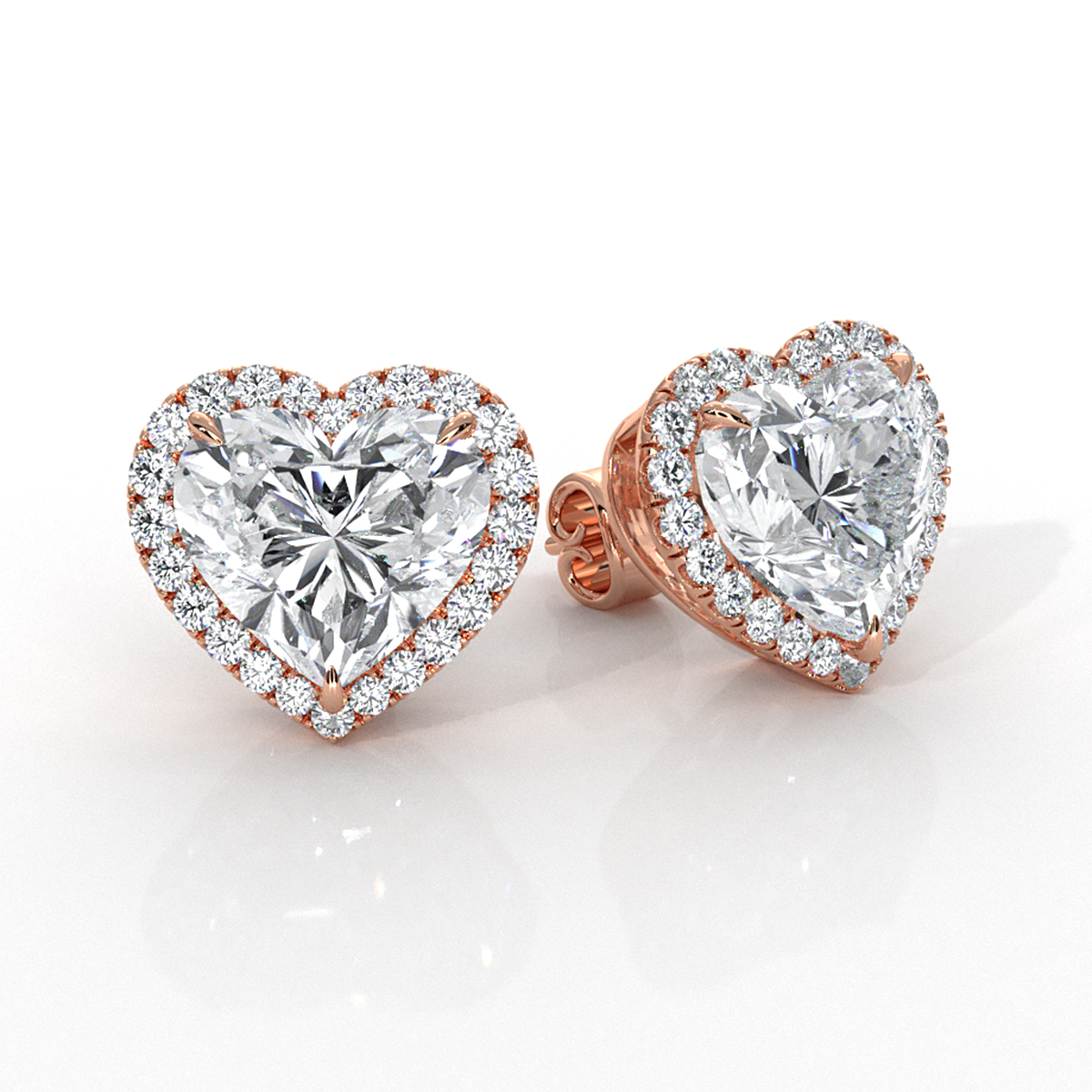 Graceful pair of halo heart shape lab grown diamond women's earrings, meticulously crafted in luminous 14k Rose Gold and IGI certified. Its showcases a carat heart diamond secured with claw prong setting, surrounded by a sparkling halo of smaller diamonds. Shimmer and Shine with Every Pair. Also available in 14k & 18k white gold, yellow gold, rose gold and platinum 950. If you don't find your desired jewelry, please don't hesitate to contact our designer to make your custom jewelry designs. (5.35Ct. tw.)