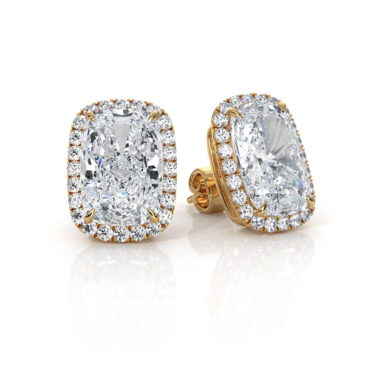 Elegant halo style women's earrings featuring exquisite lab-grown cushion diamonds, meticulously crafted in lustrous 14k Gold Yellow and certified by IGI. These mesmerizing earrings are designed to elevate any attire, showcasing carats cushion diamond surrounded by a dazzling halo of smaller diamonds, securely held in place by claw prongs. Also available in 14k & 18k white gold, yellow gold, rose gold and platinum 950. If you don't find your desired jewelry, please don't hesitate to contact our designer to make your custom jewelry designs. (4.29Ct. tw.)