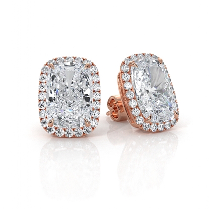 Elegant halo style women's earrings featuring exquisite lab-grown cushion diamonds, meticulously crafted in lustrous 18k Rose Gold and certified by IGI. These mesmerizing earrings are designed to elevate any attire, showcasing carats cushion diamond surrounded by a dazzling halo of smaller diamonds, securely held in place by claw prongs. Also available in 14k & 18k white gold, yellow gold, rose gold and platinum 950. If you don't find your desired jewelry, please don't hesitate to contact our designer to make your custom jewelry designs. (4.29Ct. tw.)
