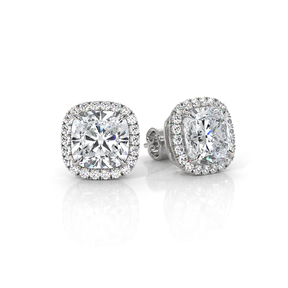 Elegant halo style women's earrings adorned with exquisite lab grown cushion diamonds, masterfully crafted in lustrous 18k Gold White and certified by IGI. These captivating earrings are designed to complement any attire, featuring a carat cushion diamond secured with claw prong setting. Also available in 14k & 18k white gold, yellow gold, rose gold and platinum 950. If you don't find your desired jewelry, please don't hesitate to contact our designer to make your custom jewelry designs. (2.2Ct. tw.)