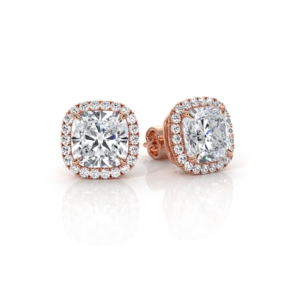 Elegant halo style women's earrings adorned with exquisite lab grown cushion diamonds, masterfully crafted in lustrous 18k Rose Gold and certified by IGI. These captivating earrings are designed to complement any attire, featuring a carat cushion diamond secured with claw prong setting. Also available in 14k & 18k white gold, yellow gold, rose gold and platinum 950. If you don't find your desired jewelry, please don't hesitate to contact our designer to make your custom jewelry designs. (2.2Ct. tw.)