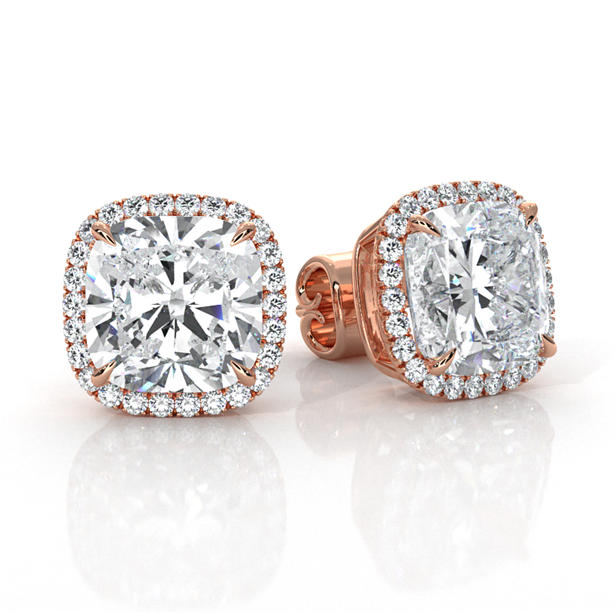 Purely Sparkling Perfection of halo style women's earrings embellished with stunning lab grown cushion cut diamonds, meticulously fashioned in 18k Rose Gold and certified by IGI. This sparkling earrings showcasing a carat cushion cut diamond securely set with claw prongs. Also available in 14k & 18k white gold, yellow gold, rose gold and platinum 950. If you don't find your desired jewelry, please don't hesitate to contact our designer to make your custom jewelry designs. (6.31Ct. tw.)