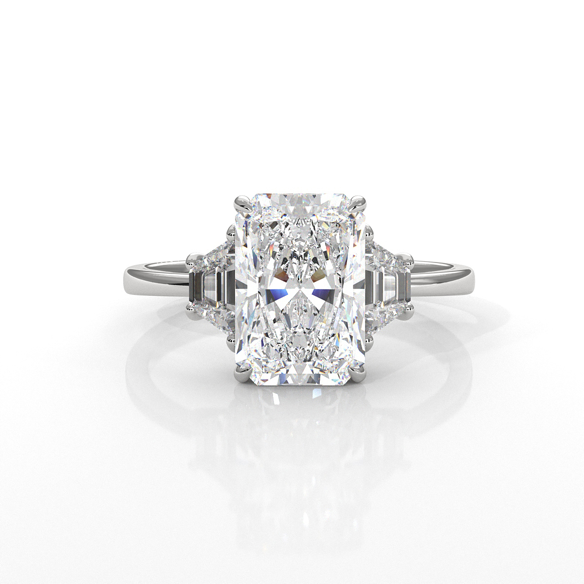 Simply elegant 3 stone radiant cut lab grown diamond engagement ring crafted to perfection of 18k Gold White and certified by IGI. This anniversary ring features carat radiant cut diamond and