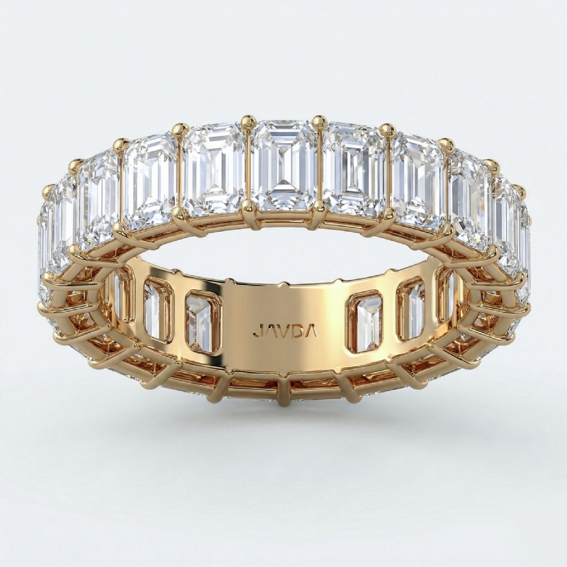 Gorgeous women's eternity emerald cut lab-grown diamond wedding band meticulously handcrafted in 14k Gold Yellow. This wedding band showcases a carat emerald diamonds in shared prong setting IGI Certified ensuring its quality. This stunning accessory will elevate the appeal of any outfit, also available in 14k & 18k white gold, yellow gold, rose gold and platinum 950. If you don't find your desired jewelry, please don't hesitate to contact our designer to make your custom jewelry design. (6.2Ct. tw.)