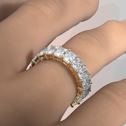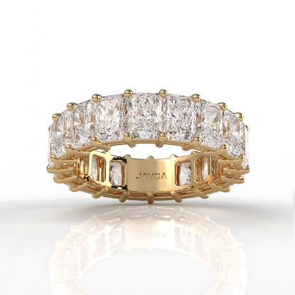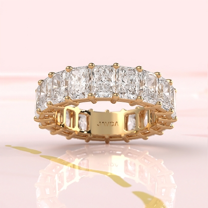 This shared prong women's eternity wedding band is a stunning statement piece, designed to shine on its own or complement an engagement ring perfectly. Featuring carat total weight of radiant shaped lab grown diamonds, it?s crafted with care in 14k Gold Yellow. Also available in 14k & 18k white gold, yellow gold, rose gold and platinum 950. If you don't find your desired jewelry, please don't hesitate to contact our designer to make your custom jewelry design. (7.05Ct. tw.)