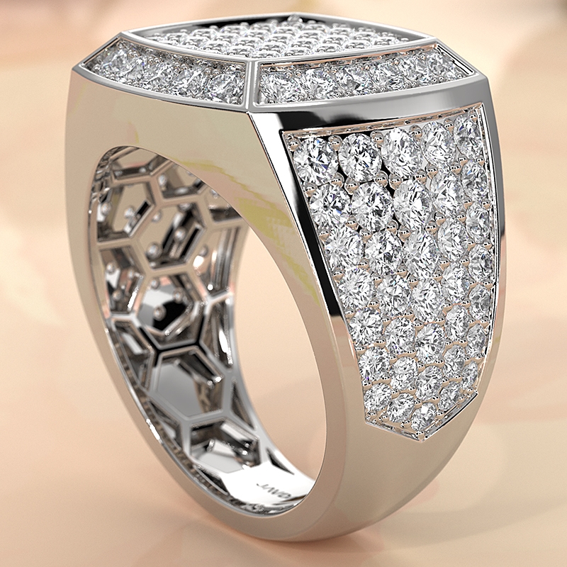 This men's square ring is crafted in luminous 18k Gold White and set with total weight of brilliant lab grown diamonds. Designed with clean lines and a powerful profile, it showcases a square setting that adds a modern, confident edge. Ethically sourced and expertly crafted, this ring blends timeless style with sustainable luxury perfect for the man who values both design and conscience. (3.11Ct. tw.)