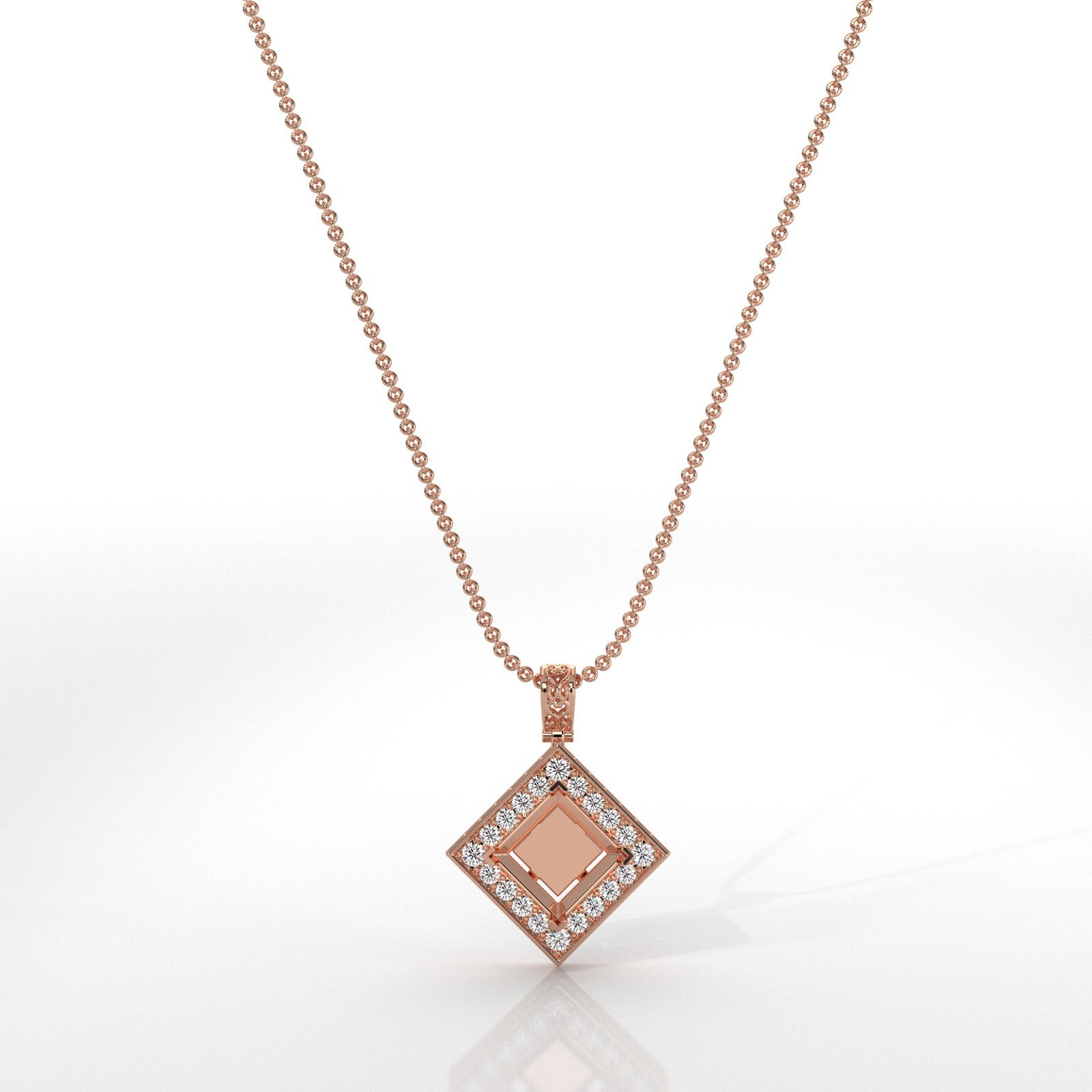 This round pave set diamond solitaire pendant is made for a princess cut center. Crafted in 14k Rose Gold, it includes a halo of sparkling accents for timeless brilliance. Perfect for gifting or adding a luxurious touch to your collection. Includes a matching rolo link chain for a polished, elegant finish.