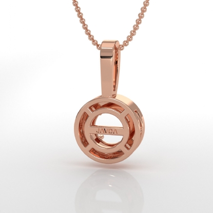 This gorgeous halo pave pendant features a round cut semi mount with a diamond-accented bail. Expertly crafted in 14k Rose Gold, it highlights exceptional craftsmanship and design. Stunning round brilliant cut diamonds beautifully encircle the center stone. Pendant measures approx. 6/16" wide ? 11/16" high and weighs 1.80 grams. Comes with a rolo link chain.
