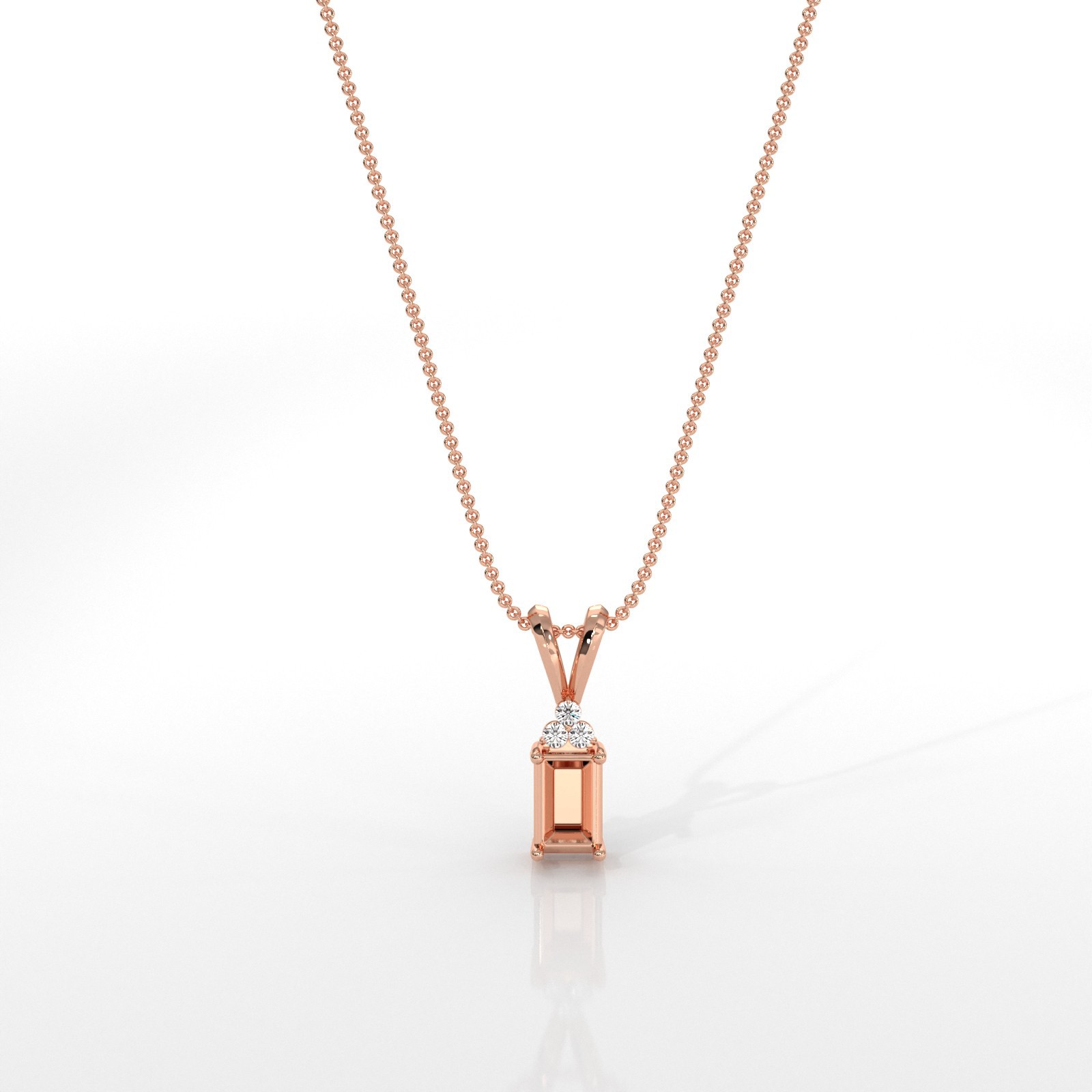 This splendid double bail prong set semi mount pendant is crafted in 14k Rose Gold. Designed for an emerald cut center stone (not included), it offers timeless elegance. Accented with round brilliant diamonds in a secure prong setting. Pendant includes a matching chain and showcases expert craftsmanship. The width of the pendant measures approximately 2/16 inches.