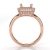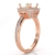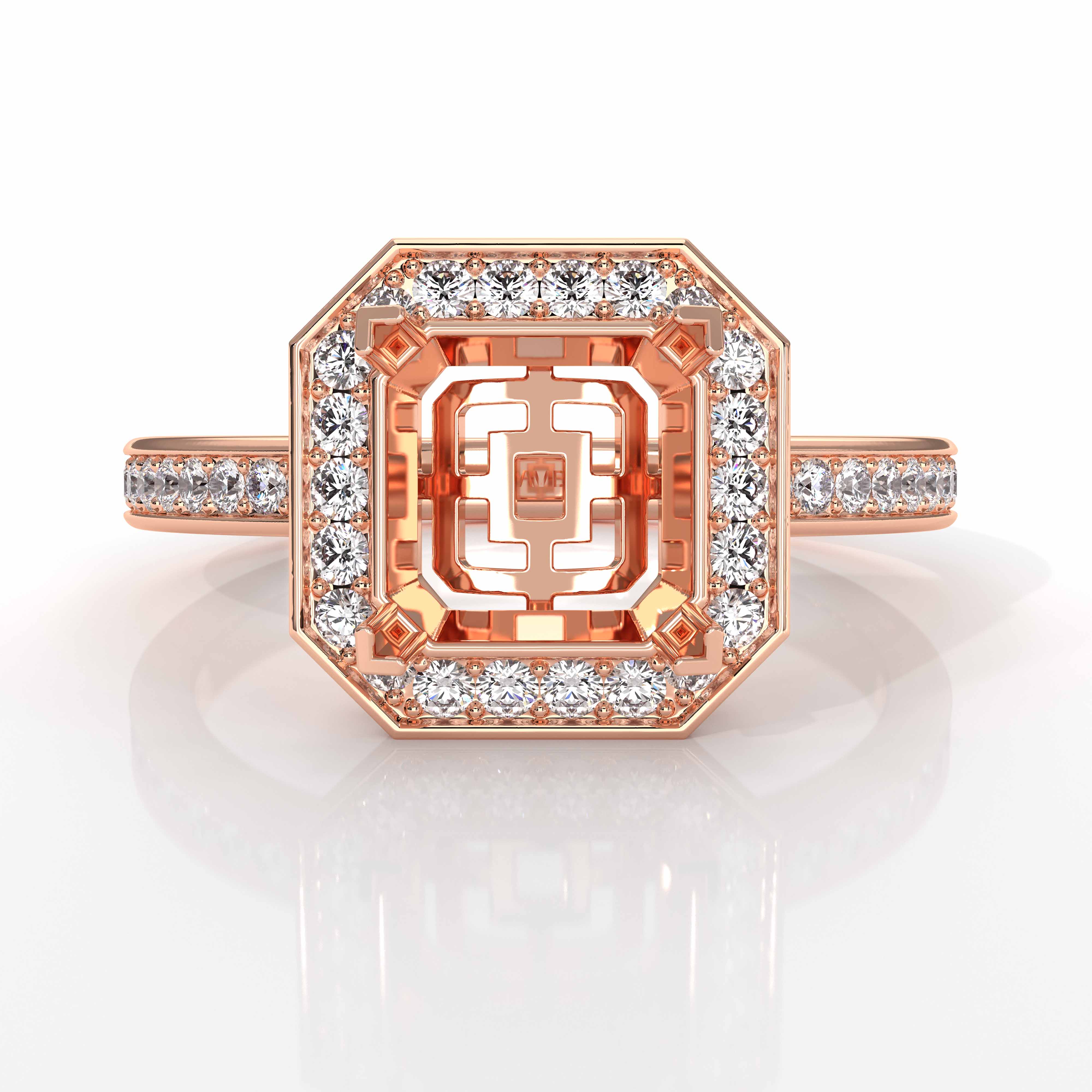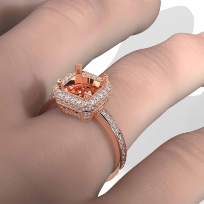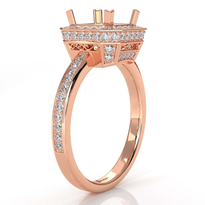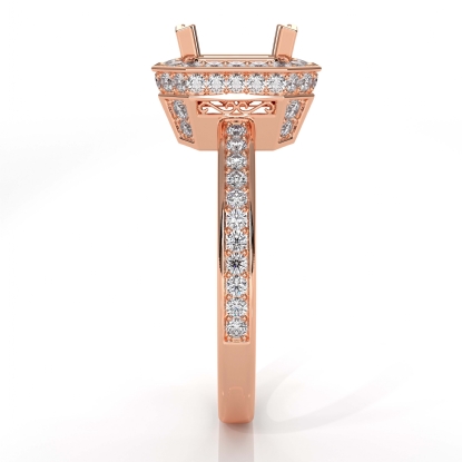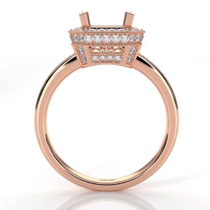 Striking yet forever timeless, this 18k Rose Gold diamond engagement ring has a princess semi mount. It showcases round pave diamonds in halo & along the shank. (1.05Ct. tw.)