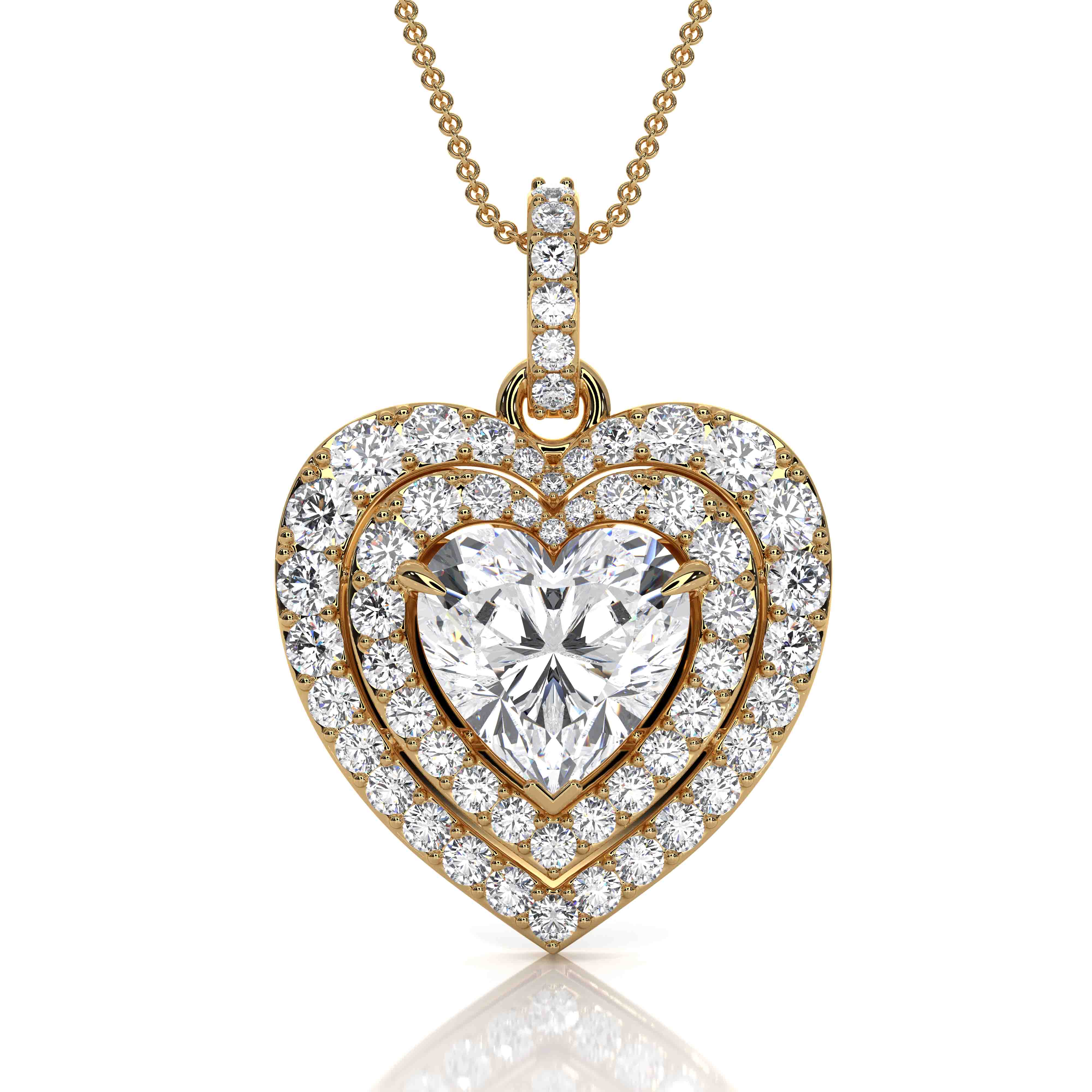 This breathtaking heart pendant is crafted in luminous 14k Gold Yellow and features a stunning heart-cut center diamond, surrounded by a sparkling halo of round diamonds for exceptional brilliance. With a total diamond weight of approximately