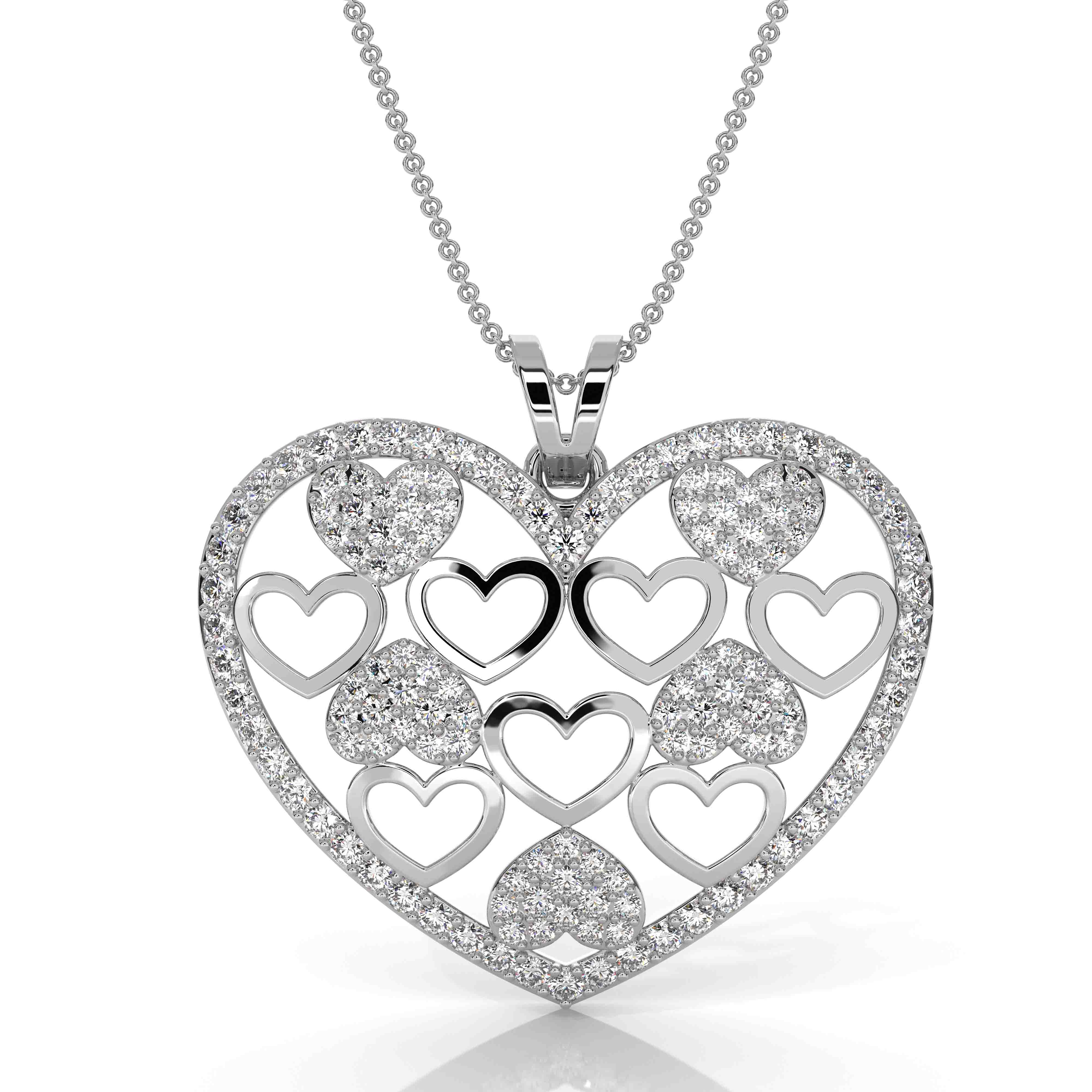 This heart-shaped pendant is crafted in solid 18k Gold White with a high-polished finish and features an intricate multi-heart open design accented with pave-set lab grown diamonds. The pendant weighs approximately 2.75 grams and contains a total of 131 round diamonds in mixed sizes, with a combined total diamond weight of . Diamonds are securely set throughout the outer heart frame and inner heart motifs, creating a consistent and brilliant appearance. The pendant includes a polished bail designed to accommodate a standard chain and is offered as a pendant only. (0.61Ct. tw.)