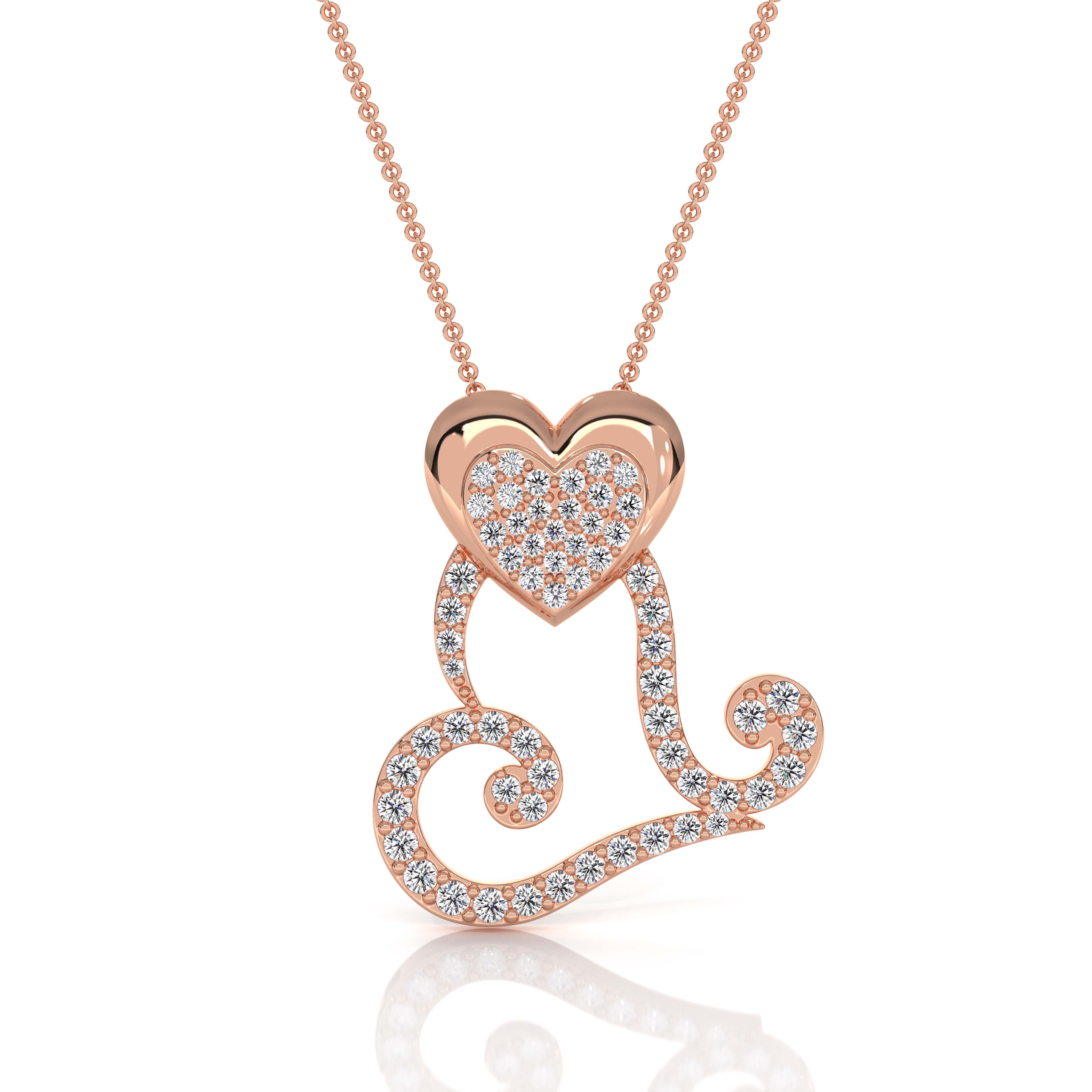 This elegant heart scroll pendant is beautifully crafted in solid 14k Rose Gold and designed to symbolize love, movement, and timeless romance. The pendant features a polished heart centerpiece filled with shimmering round lab grown diamonds, flowing into a graceful scroll silhouette accented with additional diamonds along the curves. A total of 62 round diamonds are carefully set to enhance brilliance and sparkle from every angle, with a combined diamond weight of approximately . The smooth high-polish finish contrasts perfectly with the pave diamond setting, creating a refined and luxurious appearance. Weighing approximately 2.45 grams, this pendant offers a comfortable yet substantial feel, making it ideal for everyday elegance or special occasions. (0.33Ct. tw.)