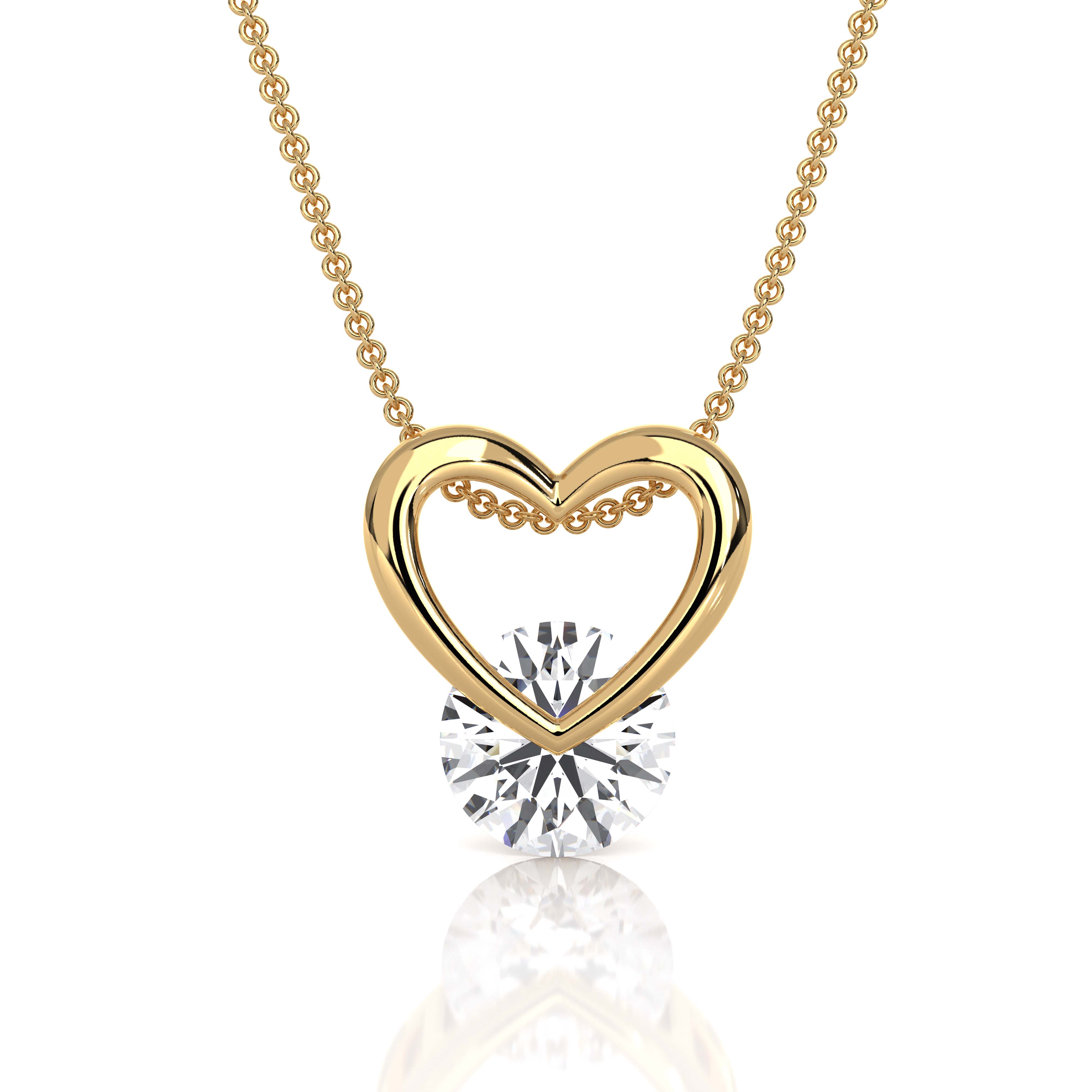 This elegant heart-shaped pendant is crafted in solid 14k Gold Yellow and features a stunning round brilliant-cut diamond suspended beneath a polished open-heart design. The pendant showcases 1 lab grown diamond with a total carat weight of approximately , offering exceptional brilliance and eye-catching sparkle. The sleek high-polish gold finish enhances the timeless romantic look, making it perfect for everyday wear or special occasions. With an approximate gold weight of 0.90 grams, this pendant is lightweight yet luxurious in appearance. (0.8Ct. tw.)