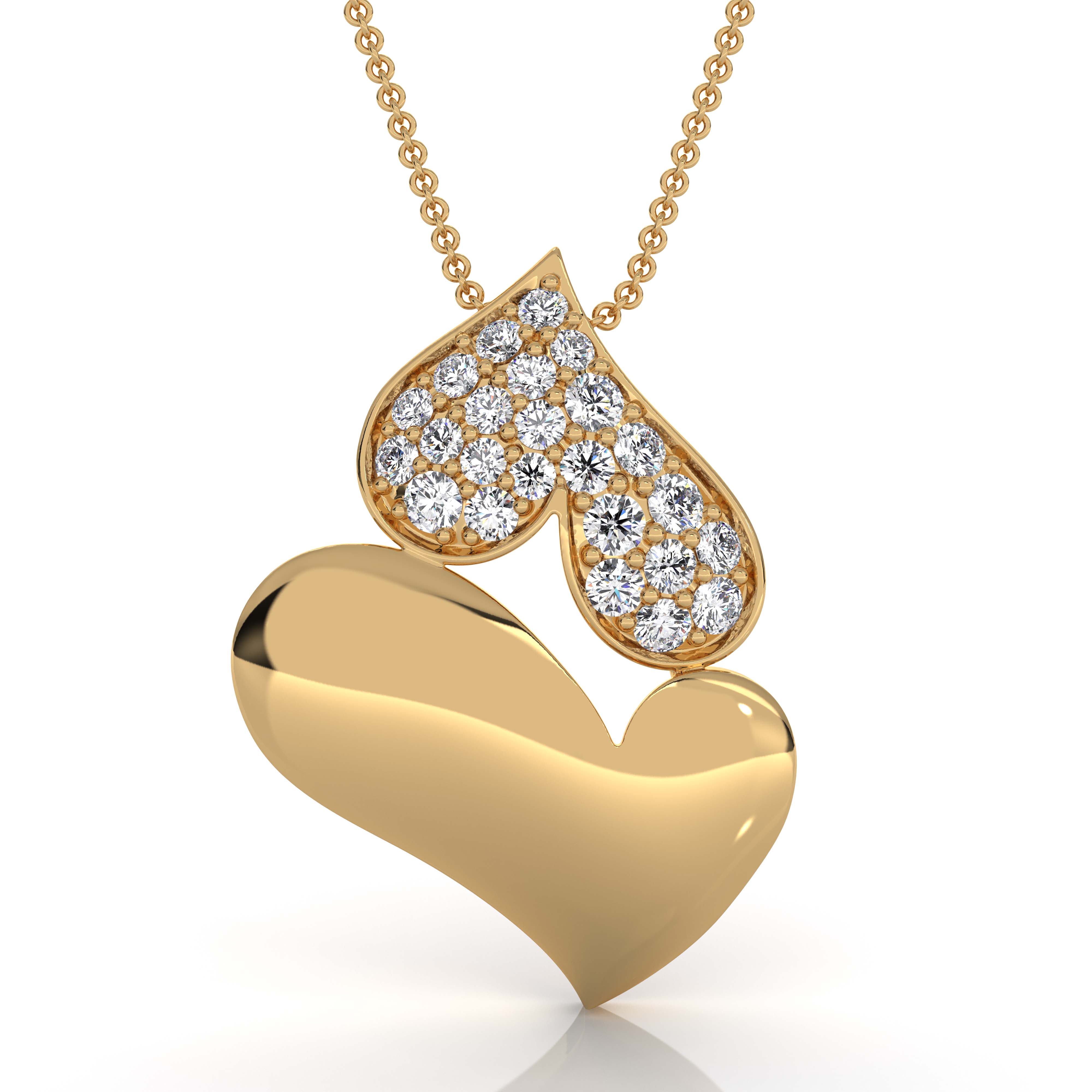 This elegant heart pendant is crafted in solid 14k Gold Yellow and features a romantic dual-heart design accented with brilliant pave-set lab grown diamonds. The pendant showcases 24 round diamonds with a combined total weight of approximately , delivering exceptional sparkle and refined brilliance. The polished white gold finish enhances the contrast between the smooth heart and the diamond-set heart, creating a timeless and luxurious look. Weighing approximately 2.6 grams, this pendant offers a substantial yet comfortable feel, making it ideal for everyday wear or special occasions. (0.24Ct. tw.)