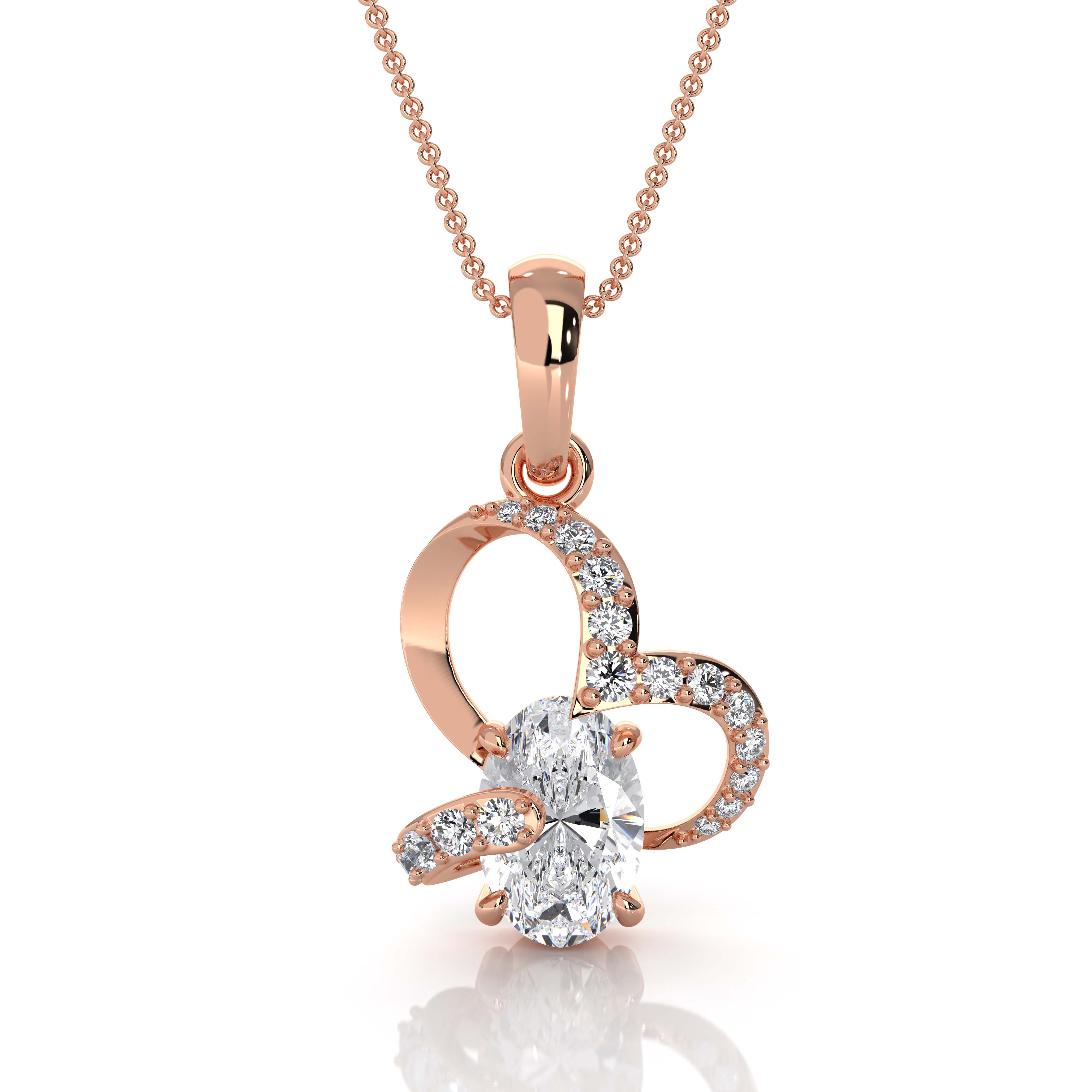 This elegant heart pendant is crafted in solid 18k Rose Gold and features a graceful open-heart design highlighted with sparkling pave-set round diamonds. At the center, a brilliant oval-cut diamond creates a striking focal point, delivering exceptional fire and brilliance. The pendant is set with a total of 19 diamonds with a combined total gem weight of approximately lab grown diamnds. The polished gold finish enhances the overall luxury appeal while offering a timeless and romantic look. With an approximate total weight of 2.55 grams, this pendant provides a refined yet substantial feel, perfect for everyday elegance or special occasions. (1.7Ct. tw.)