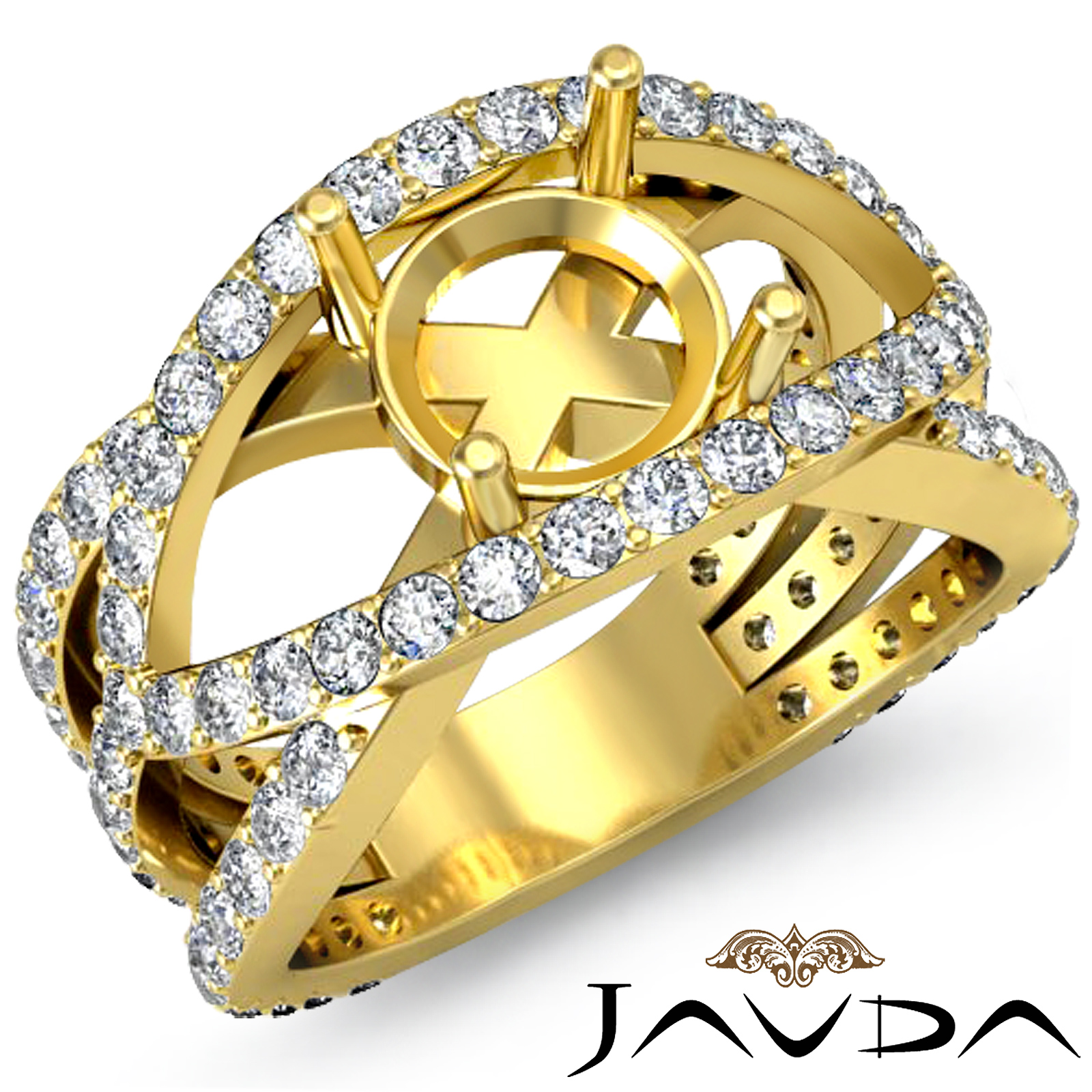 Elegant in its simplicity, this classic yet striking semi mount diamond engagement ring is made in 14k Gold Yellow. It features of pave set round diamonds along the halo and the gorgeous shank. (1.2Ct. tw.)