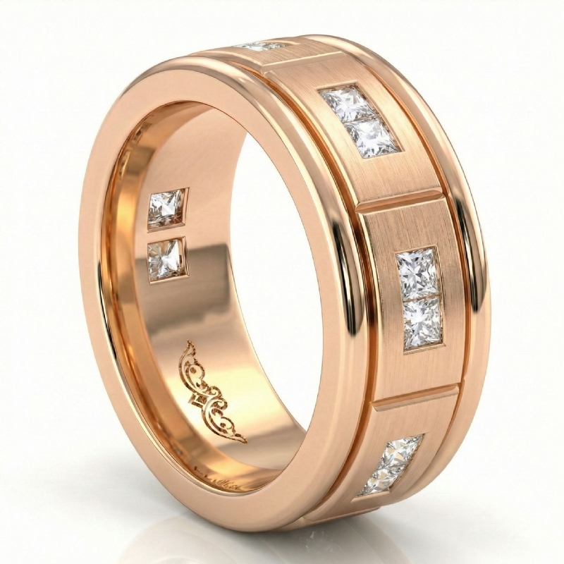 This eye catching modern men's diamond eternity wedding band handmade in 10k Rose Gold. Features a beautiful polished grooved design and princess diamonds on matte finish surface in a channel setting. This is a magnificent way to seal one's commitment, available in 14k & 18k white gold, yellow gold, rose gold, and platinum 950. (1.44Ct. tw.)
