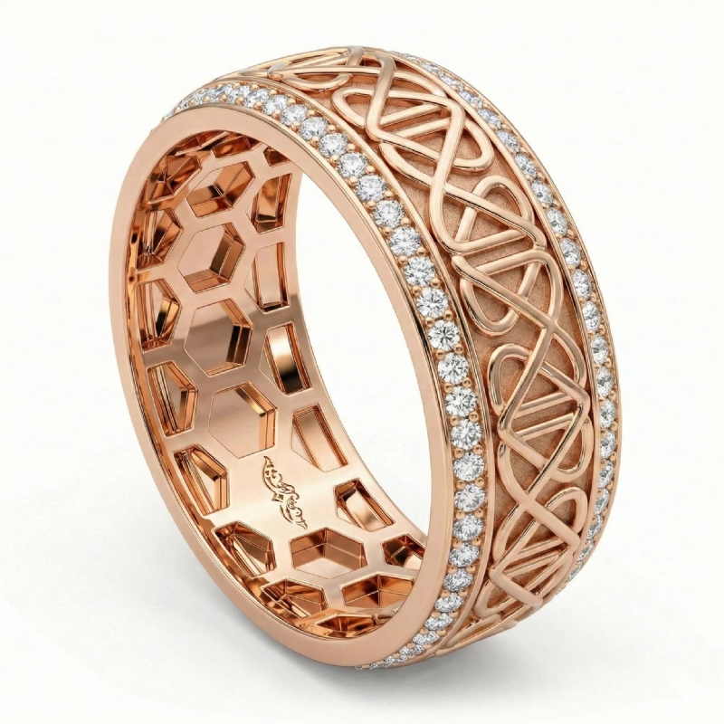 Vintage artwork celtic design round diamond eternity men's wedding band handcrafted in 10k Rose Gold. This comfort-fit high-quality ring features celtic design along the center in yellow gold with round diamonds in a micro pave setting on edges in white gold. Also available in 14k & 18k white gold, yellow gold, rose gold, two-tone gold and platinum 950. If you don't find your desired jewelry, please don't hesitate to contact our designer to make your custom jewelry design. (1Ct. tw.)