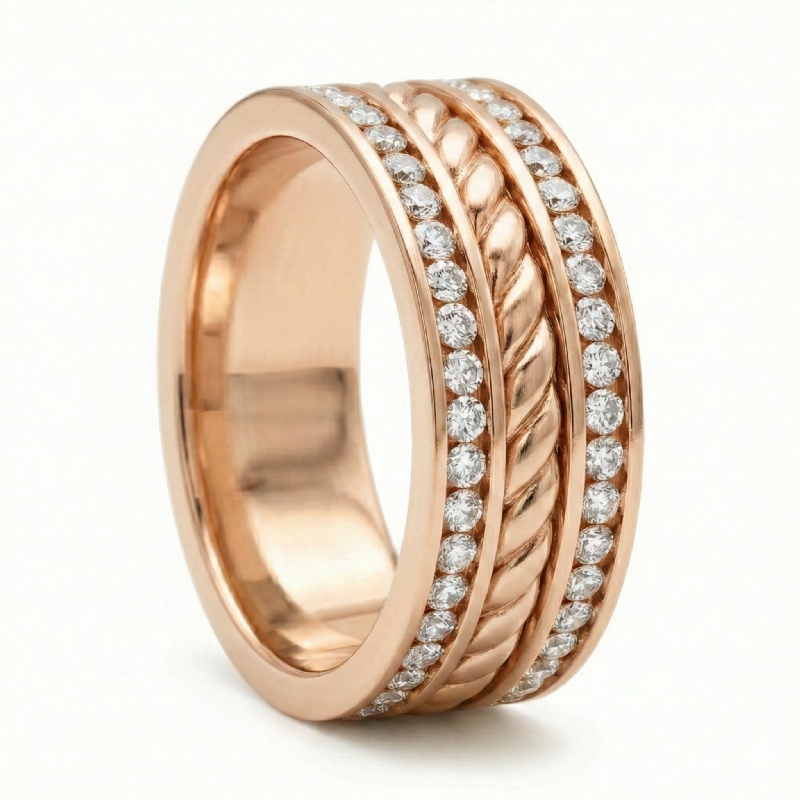 This handmade rope design men's diamond eternity wedding band is made from 10k Rose Gold. Featuring yellow gold rope design in center and round diamonds in a channel setting.