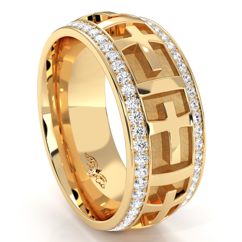 Modern diamond eternity cross pattern men's wedding band crafted in 10k Yellow Gold. This statement piece features 1.2 carat round diamonds in a micro pave setting on edges and cross design in a center. Available in 14k & 18k white gold, yellow gold, rose gold and platinum 950. (1.2Ct. tw.)
