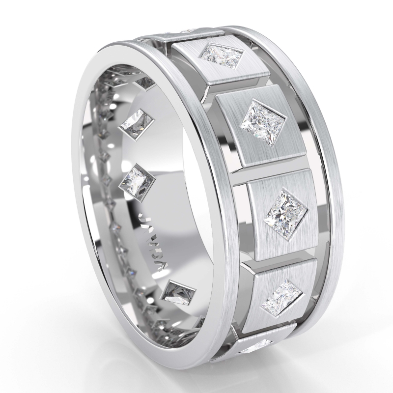 A traditional kite set princess diamond men's eternity wedding band is made from 10k White Gold. This comfort fit ring features box design with vertical and horizontal parallel grooved and princess cut diamond set in a bezel setting.